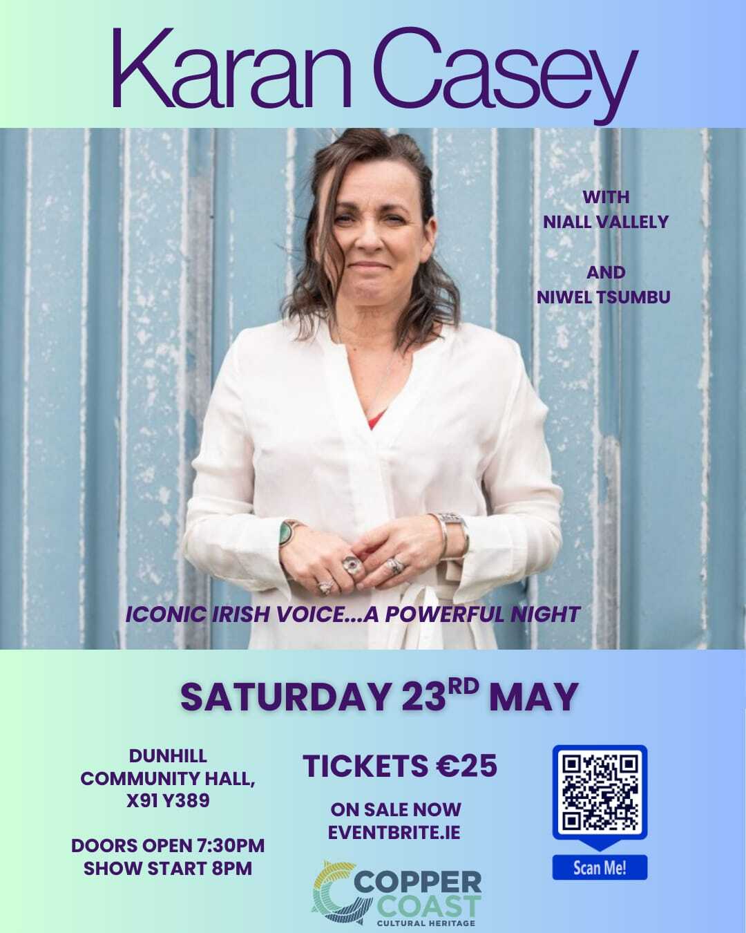 Hailing from nearby Ballyduff, national and internationally renowned singer and musician Karan Casey will be on stage on Saturday, 23rd May. Look forward to an evening of ballads, love songs, and powerful versions of social justice songs. Karan is also fond of a good yarn – it promises to be a great night. Tickets (€25) are on sale via Eventbrite: