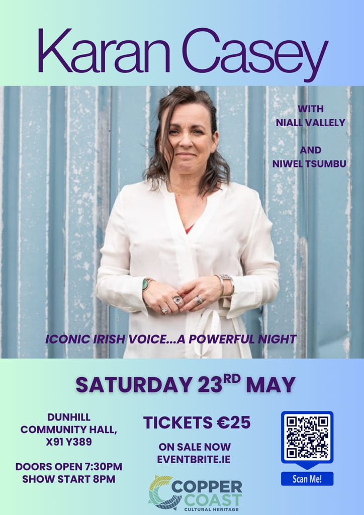 Karan, who hails from nearby Ballyduff, has been blazing a trail for more than 30 years. A lover of ballads, love songs, and searing versions of social justice songs, and fond of a good yarn, she has toured the world making deep connections with her audience via Ireland’s past while crucially repositioning women and songs in a universal and modern setting.