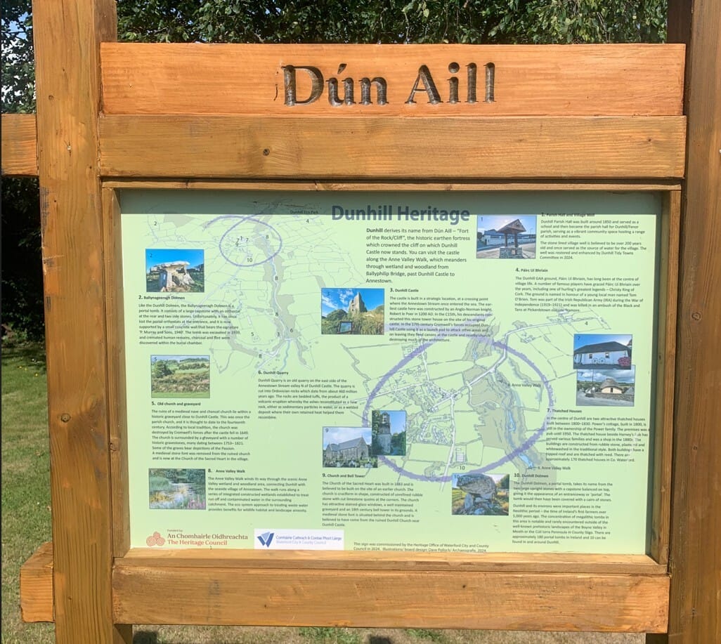 The long-awaited Dunhill Heritage Board has been erected. We applied in 2023 to Heritage Ireland for a grant for the board but were not successful. In 2024, we spoke to Waterford Council Heritage, who agreed to supply the board. Our role was to nominate the 10 Points of Interest and accompanying short detail on each point. We also provided €200 to slightly embellish the original board. The Council have agreed that we can move the existing directional signage to give a better view of the Heritage Board from a number of directions.